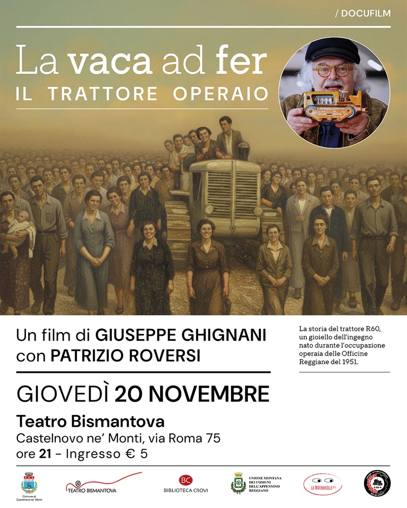 Giovedì 20 novembre 2025, al Teatro Bismantova di Castelnovo ne' Monti, si terrà la proiezione del docufilm “La vaca ad fer: il trattore operaio” di Giuseppe Ghignani con Patrizio Roversi, che saranno presenti in sala. La proiezione inizierà alle 21 (ingresso 5 euro).