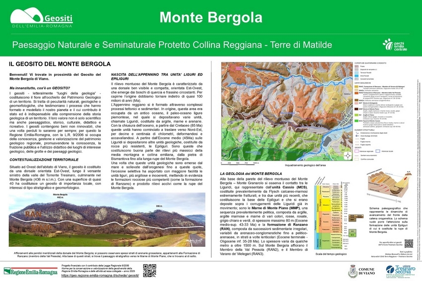 Semplice escursione sulle colline di Viano. Un anello con partenza davanti al Municipio del Comune di Viano, con primo tratto in leggera salita su asfalto. Lasciata la strada si prosegue su sterrato lungo il sentiero CAI 606A in direzione del Monte Bergola (441 m.s.l.m.). Questo è il punto più alto del Geosito che segna il punto di incontro geologico tra le unità di Cassio più antiche e quelle Epiliguri più recenti.