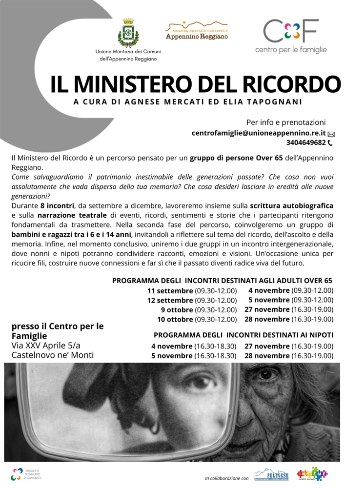 UNIONE APPENNINO REGGIANO – Il Centro per le famiglie dell’Unione dei Comuni dell’Appennino Reggiano ha organizzato una nuova attività rivolta alle persone over 65: Il ministero del ricordo è un percorso a cura di Agnese Mercati ed Elia Tapognani rivolto a residenti dell’Appennino con più di 65 anni.