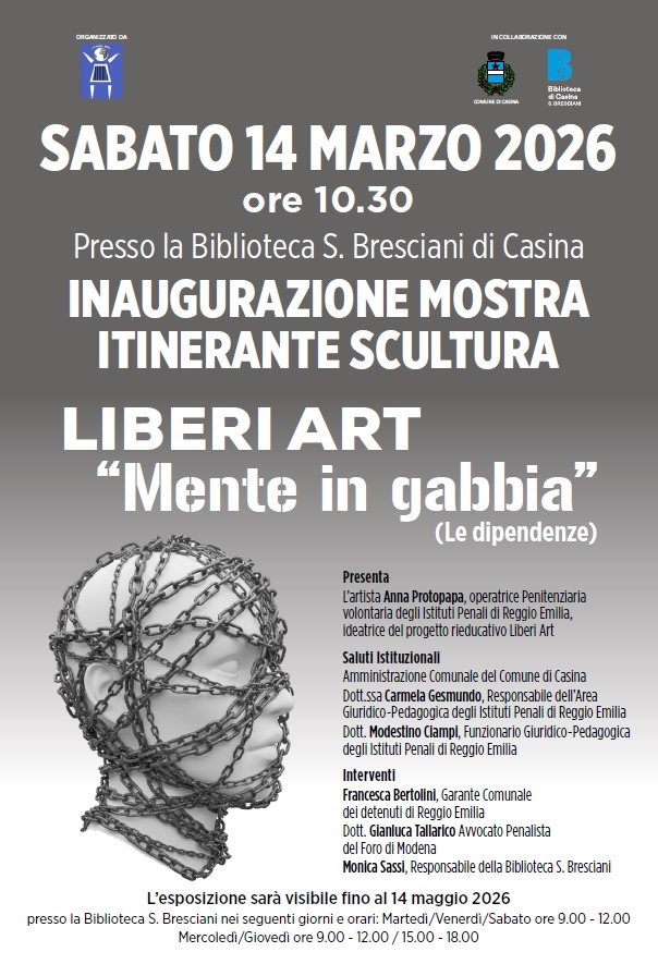La scultura “Mente in gabbia” è il risultato di un laboratorio condotto con i detenuti della Casa Circondariale di Reggio Emilia e si concentra in particolare sulle dipendenze – da sostanze, comportamentali e nuovi disturbi comportamentali quali l'uso compulsivo di internet, social media, gioco d'azzardo online, shopping, sesso – restituendo in forma simbolica un percorso di dialogo, riflessione e presa di coscienza. L’opera sarà viene esposta a Casina nell’ambito di un percorso itinerante, con un’attenzione speciale al coinvolgimento dei giovani, per stimolare una riflessione sui rischi e sui danni legati a queste problematiche.